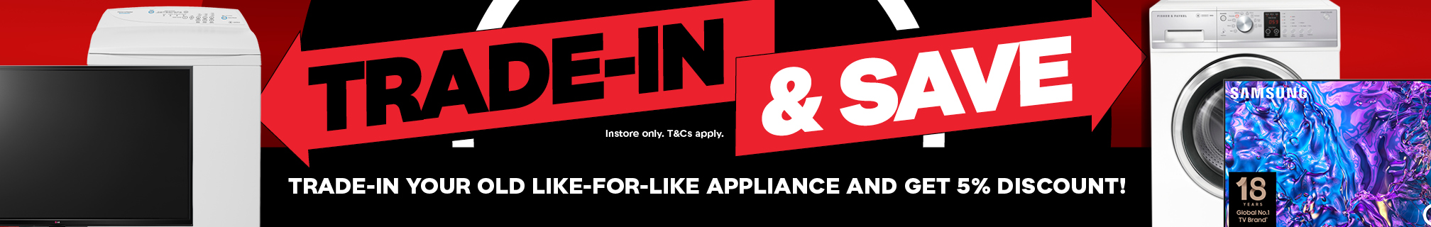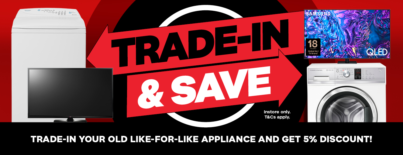 Trade-In & Save! Upgrade your home with confidence and get rewarded for recycling your old appliances. For a limited time, enjoy an extra 5% off our displayed prices when you purchase a new eligible model and trade in your old like-for-like appliance (for example, buy a fridge, trade-in a fridge).
